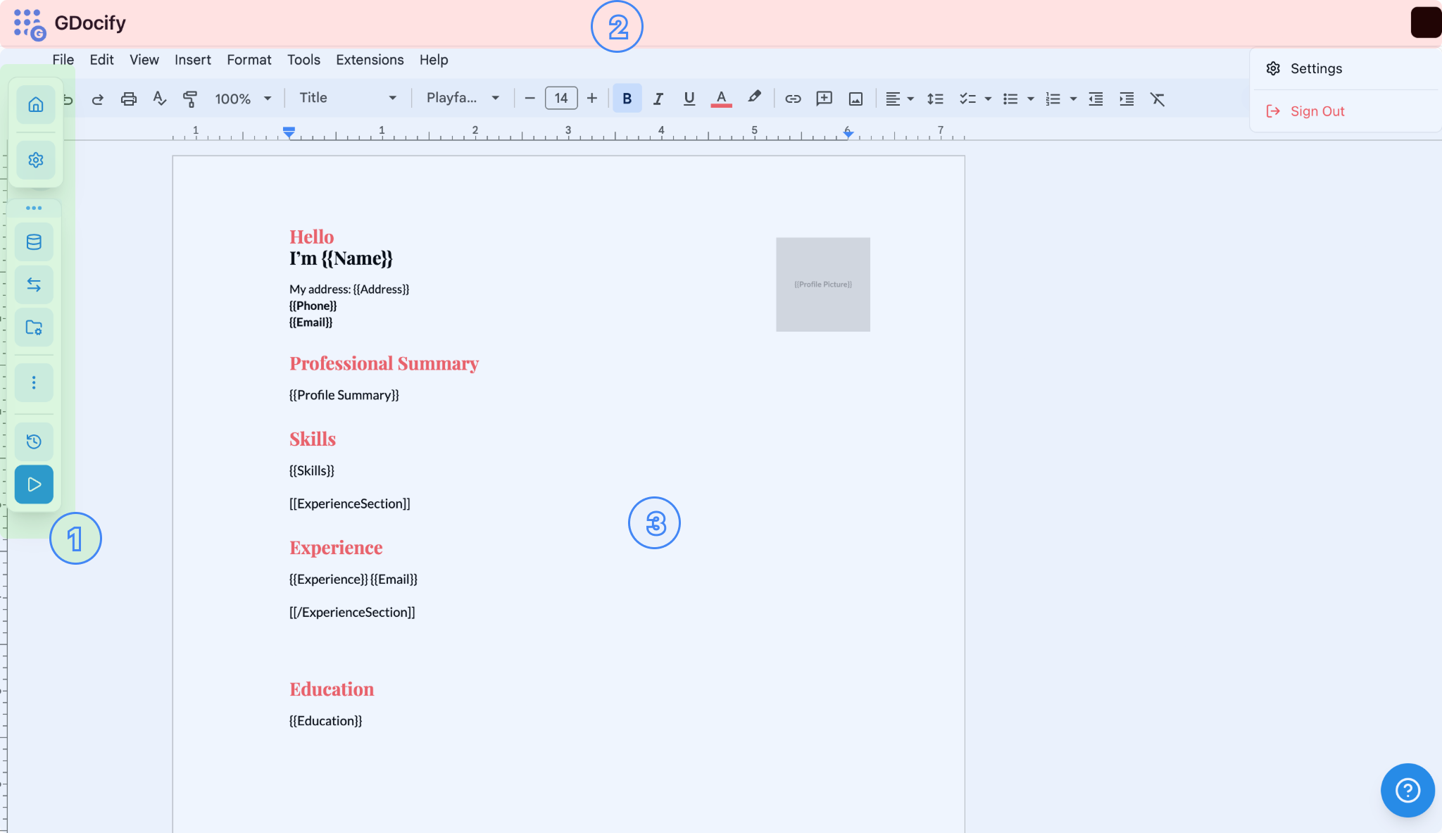 Once your template is selected, you'll see the Gdocify editor:
