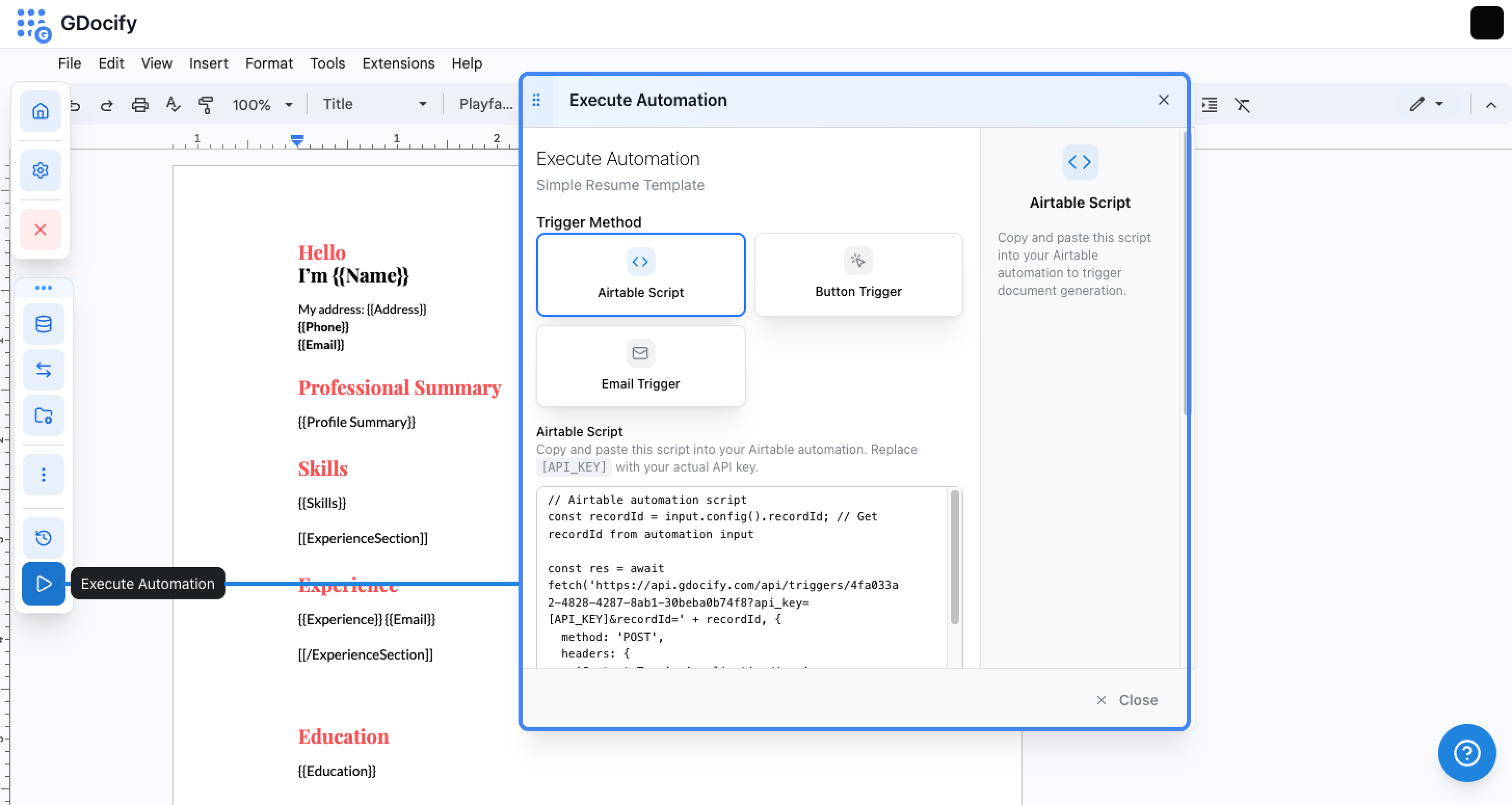 - Copy the script from the Execute Automation dialog in Gdocify (it will include your actual trigger ID)